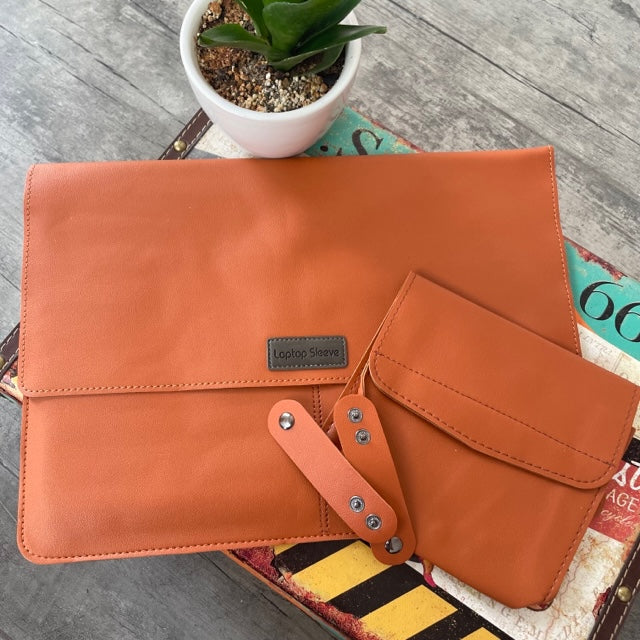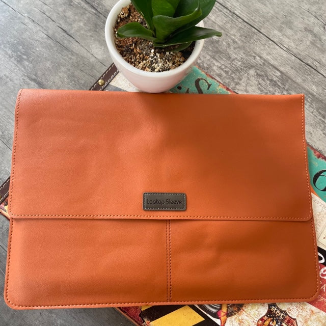Tan Brown PU Leather Laptop Sleeve With Charger Cover And Tie Down Straps